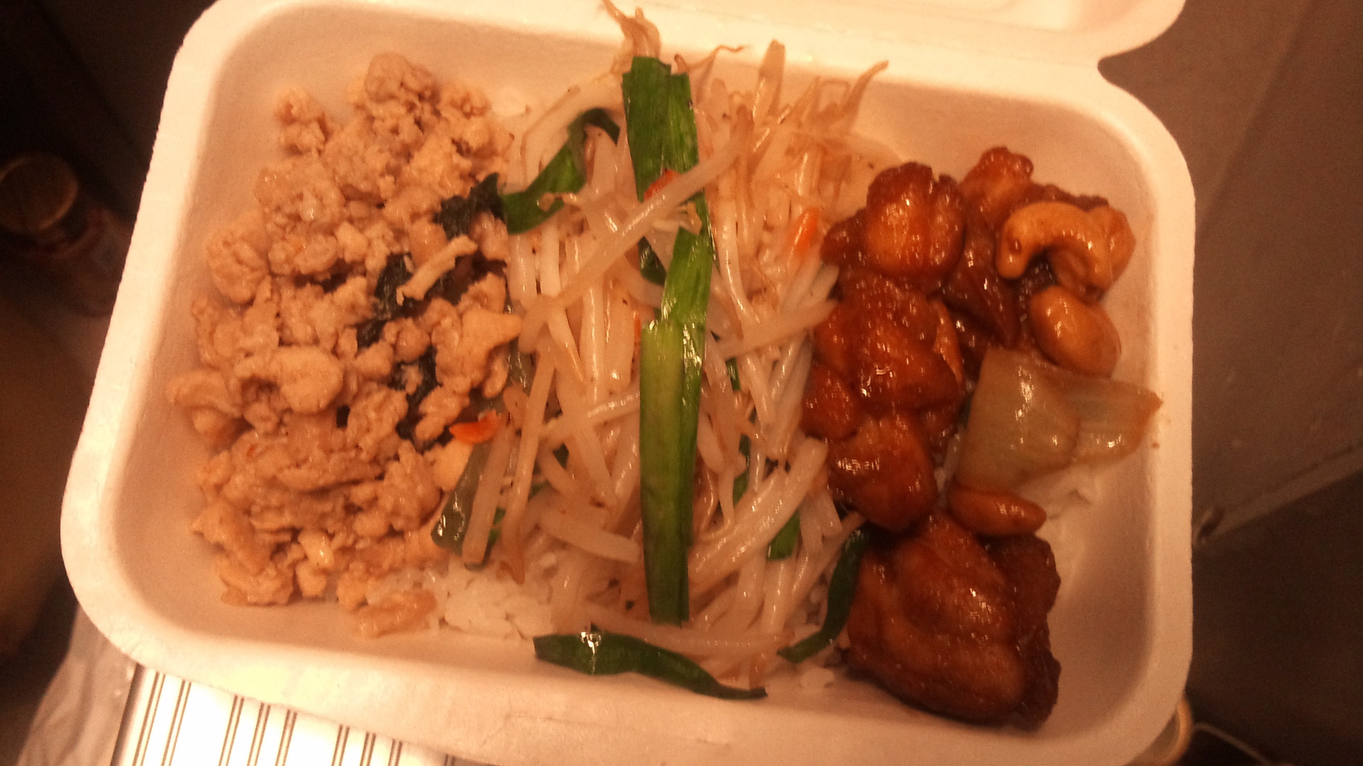 日替わりのメニューから3品選ぶことができ、ご飯の上に盛りつけてくれます。