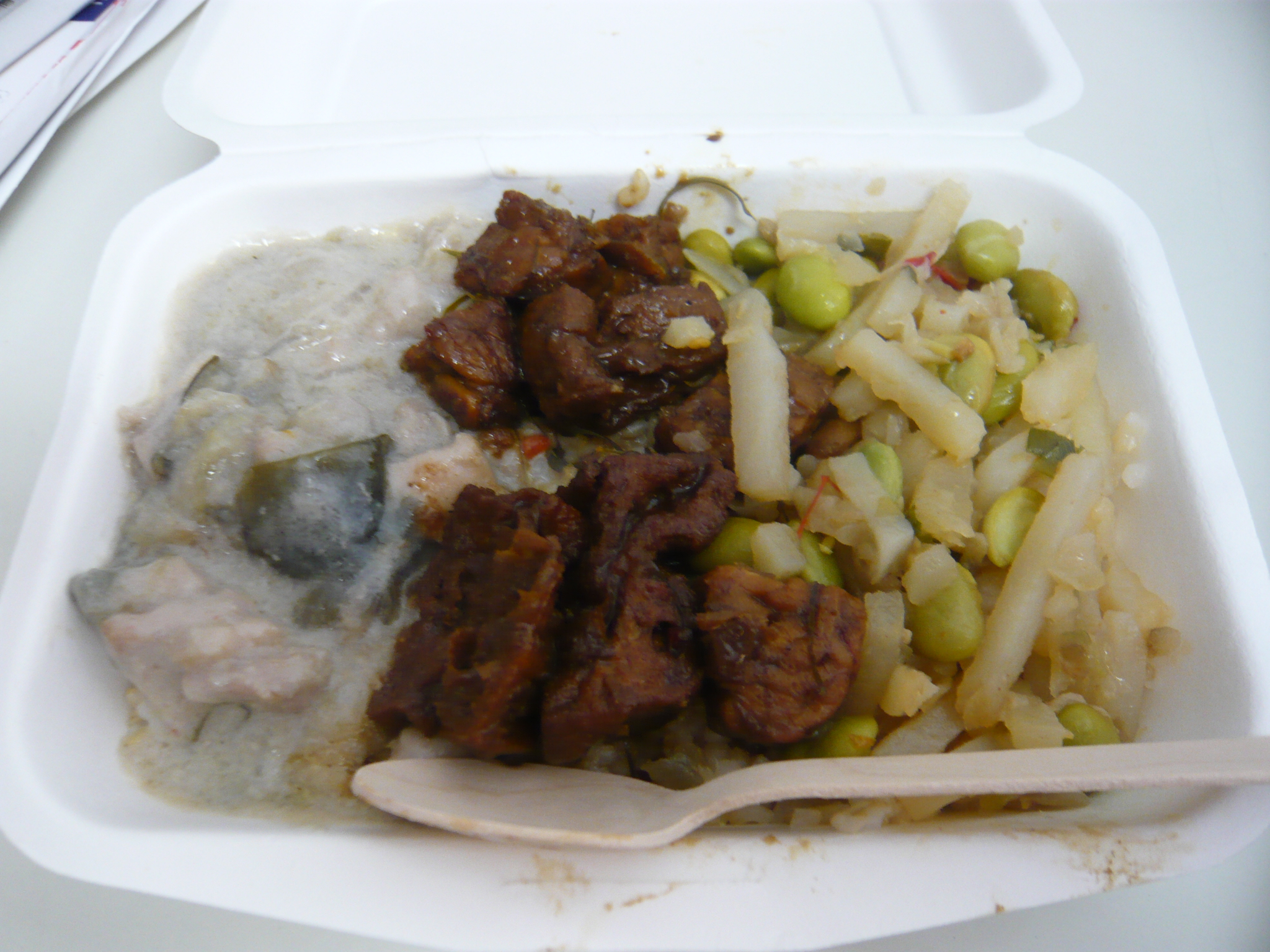 ハーブで仕上げた白いカレー、テンペ、細切りじゃがと枝豆の炒め物。