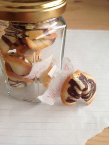 中にメッセージを挟む、日本で言うおみくじせんべいのようなモノ。