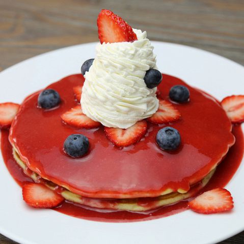 『ダイヤモンドヘッドベリーブリスパンケーキ』(1,500円)。ブルーベリー入りのパンケーキに、ストロベリーをたっぷり使った特製のソースをかけ、ストロベリー、ブルーベリー、ラズベリーをトッピングし、濃厚なホイップクリームも後を引く美味しさのパンケーキです。