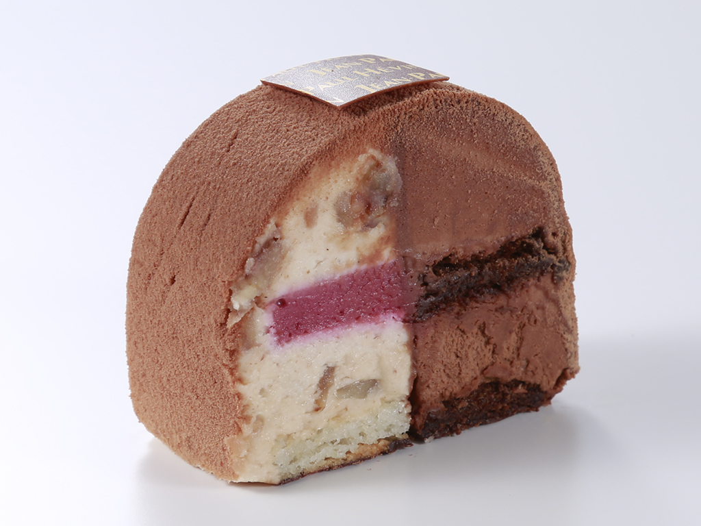 「Rencontre(出会い)」をテーマに作られた作品。ビターチョコレートのムースとカカオ風味のビスキュイ、シロップ漬けのマロンが入ったムースとマロンペーストを加えたダコワーズという異なる2種類の生地が楽しめる。甘酸っぱいカシスクリームがアクセントとなっている。