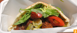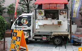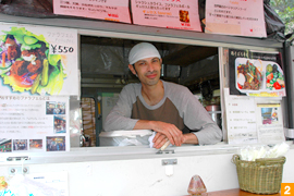 曜日ごとに異なったキッチンカーが軒を連ねるネオ屋台村の中でも、行列が絶えない人気店、「Papagaya Deli」。イスラエルでシェフを勤めていたというガイさんが本場の味を屋台でお届け。世界最古のベジタリアンフードといわれる『ファラフェル』(550円)は、ひよこ豆のペーストに20種類もスパイスを混ぜ、油で揚げたファラフェルボールをレタス、トマト、ハラペーニョなどと一緒にピタパンに挟み、ソースをかけていただきます。全て野菜とは思えないほどの満足感にきっと驚くはず。