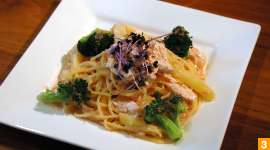 ランチメニューは、カレー、パスタ、お肉料理など日替わりで2~3種類。毎朝仕入れる旬の食材によってメニューが決まります。取材時のカレーランチは、『自家製キーマカレー』(1,000円)。じっくりと煮込んだ自家製カレーに、アスパラ、ズッキーニ、ナス、パプリカなど、季節の野菜をソテーしたものがトッピングされています。つけ合わせの温泉卵が、カレーの辛味をマイルドにしてくれます。パスタランチの『ささみ肉とブロッコリー、ジャガイモの明太クリームパスタ』(1,000円)は、新鮮な野菜とささみ肉に、コクのある明太クリームソースが絡む、満足感のある一品。森林浴さながらの空間で厳選素材のおいしいランチをいただけば、日頃の疲れもきっと癒されるはず。