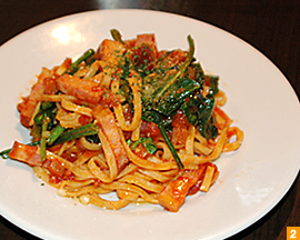 気軽な立ち飲みダイニングとして地元民にも愛されている、「青山スタンド」。ランチは、サラダとドリンクがついて680円からという嬉しい価格。そのリーズナブルさから、周辺オフィスに勤める女性で賑わいます。看板メニューは、毎朝作りたての自家製生パスタを使ったメニュー。『日替わりトマトのパスタ』(780円)と『日替わりクリームのパスタ』(780円)の2種類のソースからお好みでセレクト!旬の食材をたっぷり使ったこだわりのソースと、モチモチの食感の生パスタが絶妙に絡みます。