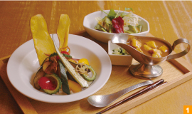 流行の発信基地、表参道ヒルズ内にある、「やさい家めい 表参道ヒルズ店」。四季折々のみずみずしいお野菜を使ったお料理を、心ゆくまで楽しむことができるお店として、女性に人気のお店です。オープン当初から、根強い人気を誇るのが『お野菜たっぷりカレー定食』(1,400円)。ほかほかのごはんの上に、夏野菜が彩り良く盛られた姿はまるでアートのような美しさです。こちらに和風出汁をベースにしたルーをとろりとかけて頂きます。優しい口当たりのルーが野菜本来の風味を引き立て、心も満たしてくれるとっておきの一品です。