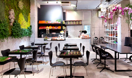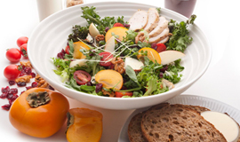 色とりどりの花々に囲まれたオーガニックなカフェでの人気No.1メニューは「サラダセット」。11月から「ウィンター チキンサラダセット 全粒粉パン付き」(1,575円)とリニューアルし、ウォールナッツや柿に、ローストチキンも入ってボリューミーに。女性はもちろん男性も満足できる、オススメメニューです。