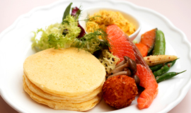 地元マダム御用達の「Deux Anges」で、休日に人気なのが『ちょっと豪華なパンケーキプレート』(1,500円)。ヨーグルトを使用したふわふわのパンケーキとサーモン、コロッケ、スクランブルエッグ、温野菜などたっぷり楽しめる大満足のプレート。ペット連れOKな広いテラスでファミリーブランチはいかが?