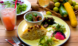 カフェでのブランチだけでなく、フィットネスも楽しめる「WIRED CAFE〈 〉FIT 代々木公園店」。トレーラーハウスをリメイクしてつくられた、店内で頂く『YOGGY'S ミールスセット』(1,380円)は旬の、野菜をたっぷり使ったヘルシーなベジプレート。代々木公園の隣で、ご機嫌な週末を過ごしてみては。