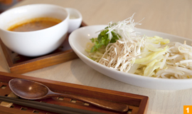 中でもオススメなのが『トムヤムつけそば』(950円)。ココナッツミルクとレモングラスを使った濃厚なスープは、まろやかな甘みと青唐辛子の程良い辛さが絶妙。鶏胸肉のゆでほぐし、ゆで野菜などのヘルシーな具材に、お好みに合わせて絞ったライムでさわやかな酸味をプラス。麺は中華手打ち麺、ビーフン、1玉わずか18kcalのこんにゃく麺の3種類から、セレクトできます。