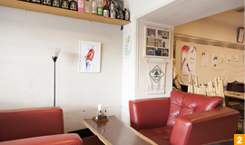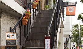 キラー通り沿いのレトロな印象の建物の階段を登った所にある「粥麺楽屋 喜々」。