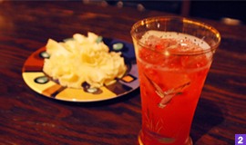 秋のオススメは、『garnet (ガーネット)』(1,200円)。ザクロとカルヴァドス (りんごの蒸留酒) をクラッシュさせた、フレッシュで飲みやすいお酒です。炭酸がきいており、ザクロの軽い甘みとりんごの酸味のバランスが絶妙。