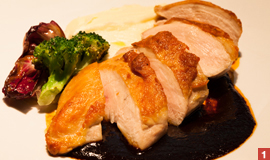 燻製料理の専門店での人気メニューは『とても柔らかい若鶏の胸肉 甜麺醤&ガラムマサラのソースで』(2,200円)。軽く味付けをした若鶏の胸肉をまずは桜のチップで30〜40分燻製にし、さらにそのお肉を袋に密封。お湯の中に入れてじっくりと火を通し、その後表面を焼いたら最後はオーブンへ。こうすることで、中はしっとりジューシー、表面はカリッとした最高の状態に。ソースは中華に使われる甘辛い甜麺醤とスパイシーなガラムマサラを混ぜ合わせたもの。ジューシーなお肉と後引く甘辛いソースがベストマッチな一品です。