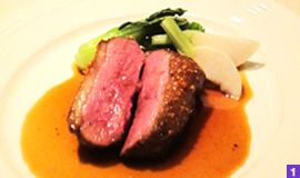 『シャラン鴨のロースト』(2,800円)は、“エトフェ”という血抜きをせず屠鳥する手法で、より風味の高い味に仕上げたフランスの“シャラン鴨”をローストした料理。お肉は肉厚で、とてもジューシーな鴨に、オレンジソースの爽やかで程よい甘味が、鴨肉のコク深い味わいを引き立てます。