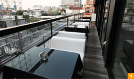NYスタイルのカフェ「MERCER CAFE TERRACE HOUSE」。お店の窓側に長いテラスがあり、晴天の日には空を仰ぎながらゆったりとランチを楽しめます。ソファータイプのチェアで座り心地がよいのも、テラス席に長居したくなる理由のひとつ。