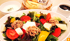 初夏におススメの『サラダランチ』(1,300円) はアップルビネガーとオリーブオイルで作った自家製のドレッシングとの相性が絶妙です。手作りのボイセンベリージャムを添えたハーフベーグルとマフィン、日替わりスープも付いてお腹も大満足できるボリューム。