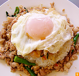 また、『バイカパオ』(990円)はこの店の一番人気。ご飯の上にたっぷりのバジルや秘伝の調味料で炒めた鶏のひき肉、ふるふる揺れる半熟目玉焼きがのっています。食べる際はお好みで辛味を足して、かき混ぜてからどうぞ。