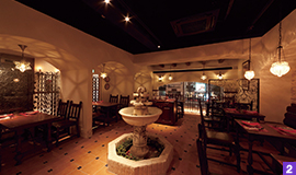 「サングリア」は本場スペインの雰囲気を楽しむことができるお店。中央には噴水が設けられ、直輸入の家具で整えられた店内は、シーンに合わせて、カウンターやソファー、個室等、ゆったりとしたムードでデートや女子会にもピッタリ。