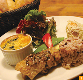 ランチタイムのお薦めは『ランチプレートwithスープ』(1,620円)。プレートにサラダ、雑穀バターライス、ポテトサラダ、肉料理、フランが盛り付けられています。卵を蒸し焼きしたフランはふわっとした優しい卵の味わいがどこか懐かしさすら感じさせる一品。他にもパンとスープ、ドリンクが付いておなかいっぱい食べられます。