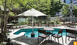 リゾートの水辺のカフェを彷彿させるプールサイドで有名な「347cafe」。