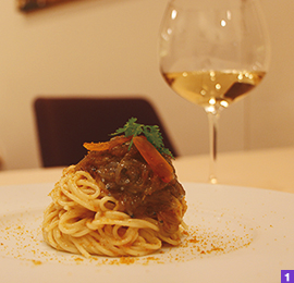 今回は創業当時からある『からすみと駿河湾産生シラスで和えた冷製フェデリーニ』(2,575円)をご紹介。パスタとからすみが乳化されていて、クリーミーでありながらサッパリしており、さらに静岡産生しらすとからすみの風味が鼻から抜ける感じが何とも言えない味わいです。お店のコンセプトでもある「モダン×こだわりの食材×古典のスパイラル」が凝縮された一品。