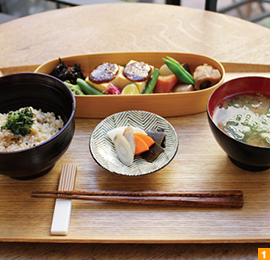 2014年9月にカフェから食堂にリニューアルオープンした、“日本の伝統”がコンセプトの「BROWN RICE CANTEEN」。野菜の皮や根まで捨てることなく、食材本来の旨みと栄養を丸ごと楽しむ調理方法で、栄養たっぷりに育った有機野菜や玄米、大豆食材を中心としたメニュー構成となっています。