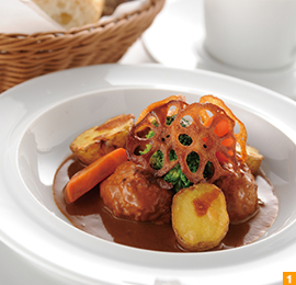『デンマーク風フリカデラ 根菜類の野菜添え』(ブレッドバスケット付き1,200円/ブレッドバー付き 1,430円)は一口サイズのジューシーなハンバーグを生クリーム、トマトペーストなどを加えた味わい深いデミグラスソースで煮込んだ一品。パンとの相性が良く、ブレッドバーより選んで頂くお好きなパンと合わせて楽しめるのも魅力です。