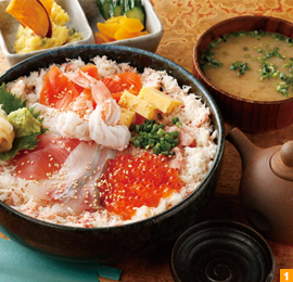 今回ご紹介するのは『特選海鮮丼』(1,480円)。長崎の五島列島から直送される新鮮な海鮮がふんだんに使用されています!大きなどんぶりの中にはネギトロやイクラやエビ、その他その日獲れた新鮮な魚などが種類豊富に盛りつけられ、カニのほぐし身がぎっしりと敷き詰めていてとても贅沢!テーブルに運ばれてきた時に思わず「おーっ!」と声が出てしまいます。合わせのお醤油は薄口の土佐醤油で、海鮮本来の旨味を引き立てます。