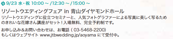 表参道駅より徒歩 2 分、南青山にオープンして約 9 年、ハワイを始めとしたリゾートウエディングをプロデュースしている「JTBウエディングプラザ南青山本店」。先輩カップルたちの生の声が沢山詰まった、ウエディングライブラリーを併設しているのが特徴です。リゾートウエディングの映像や写真は、自分たちの結婚式のイメージを膨らませられると大好評!また、挙式レポート集には、チャペルの決め手や撮影のロケーション、一緒に同行する家族やゲストとはどのような時間を過ごしたのか…など、リゾートウエディングにまつわる詳細な記録が、新花嫁さんたちへのバトンとなり、店舗を通じて受け継がれているのです。もちろん、現地を常に視察し、新鮮な情報をキャッチしている経験豊富なウエディングコンサルタントも、全力で理想のハワイウエディングをお手伝い! 世界中の挙式会場手配だけでなく、ハネムーンやゲストの旅行の手配も安心して任せられるのが、JTBウエディングプラザならでは。さらに、毎週様々なリゾートウエディング向けイベントを開催中!人気 No.1のハワイウエディング検討中のカップルに嬉しいイベントをピックアップしてご紹介します。