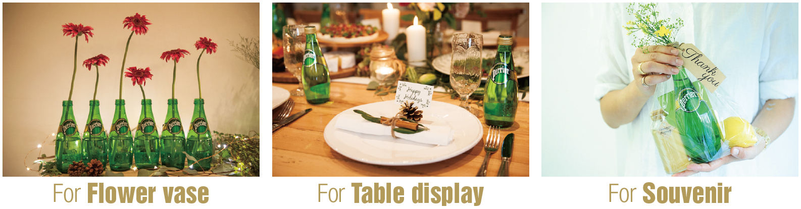 「ペリエ」!ユニークでおしゃれなグリーンのボトルも、うまく演出に使っておもてなしが