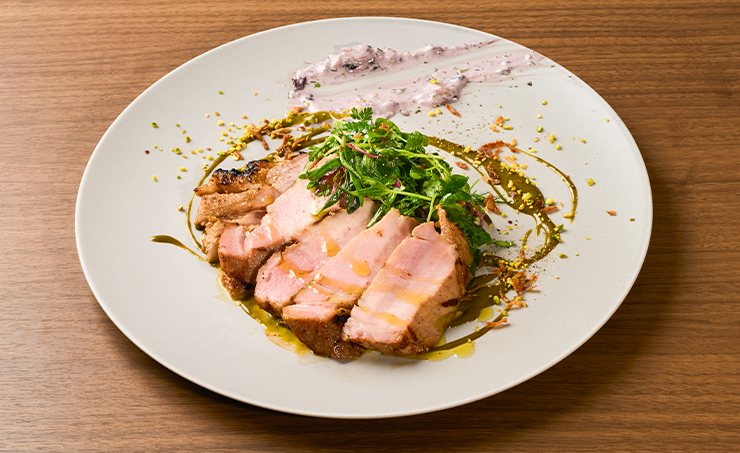 ゴルゴンゾーラとバジルでマリネされたロース肉は、塩気とバジルの清涼感も感じつつ、驚くほど、しっとり柔らかく仕上がっています。ピスタチオベースのスパイシーなソースとハーブヨーグルトソースとも相性抜群です。