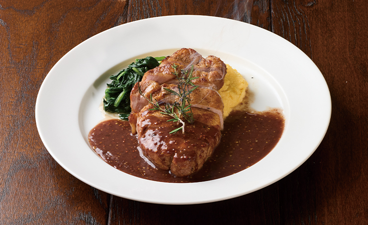 スパイスでマリネしたアメリカンポークは厚めにカットされて、ボリューム満点。付け合わせのトウモロコシのグリッツと一緒に楽しむことで、スパイシーさと甘さが見事にマッチ。提供時のローズマリーを燃やして香りを立たせる演出も要チェックです!