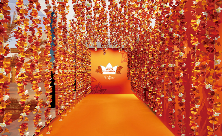 KINGʼS ORANGE ISLANDへの入口は、こちらから!ブランドカラーでもある、オレンジのお花いっぱいで彩られた空間で、訪れる全ての人々を歓迎します。まさに、ハワイ創業のキングスハワイアンならではのアロハスピリットを体感できるスペースです。