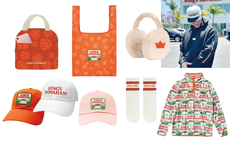 キングスハワイアンは、ファッションシーンでも注目の的!レトロ感が唯一無二なロゴが目を惹くアパレルや小物、さらには LA の人気ブランド「Japangeles」とのコラボウェアなども登場します。日本未発売の限定アイテムも並ぶので、お見逃しなく。
