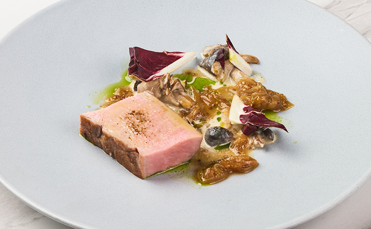 旨味をしっかりまとうようにあらかじめ脱水をして、真空の状態で丁寧にローストされたヒレ肉は、噛むたびにアメリカンポークの旨みが口の中に広がります。トリュフなどのキノコを使ったクリーミーなソースと、ローズマリーの香るスパイシーな野菜がローストポークの味わいを引き立てています。ぜひ一緒に楽しんでください。