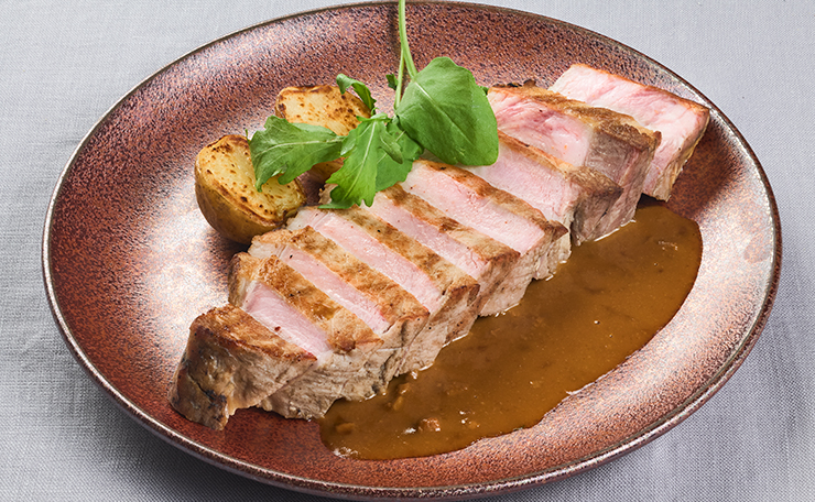 丁寧に火入れされたロースは、美しいピンク色が食欲を誘う一皿。秋のさつまいもと優しい甘さのりんごコンポートを合わせれば、アメリカンポークの旨みが一層引き立ちます。ギリシャヨーグルトの爽やかなソースが、ひと口ごとに心地よい変化を演出します。
