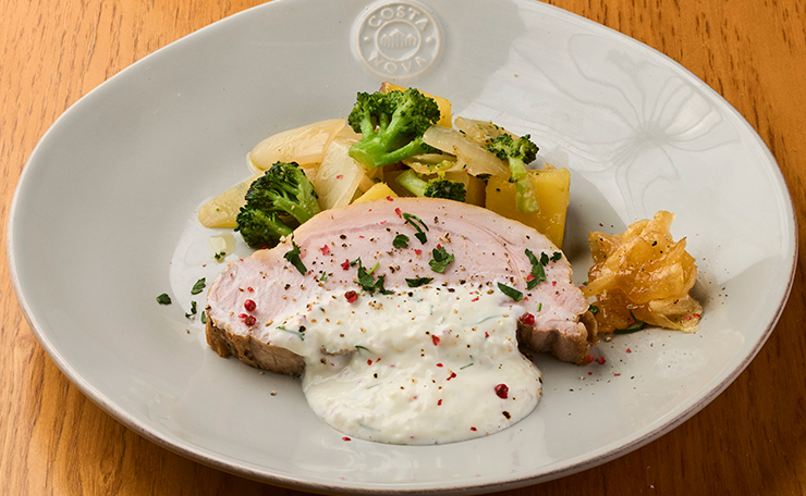 低温調理US産ローストポークのギリシャヨーグルトソースとりんごのジャム添え