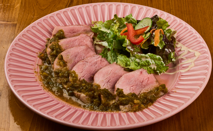 アメリカンポークを塩こうじで漬け込みローズマリーとガーリックと共にスモークした後、4時間かけて低温ロースト。香ばしくスモーキーなローストポークは、粒マスタードベースのソースと相性抜群で、付け合わせのご飯が思わず進む味わいです。