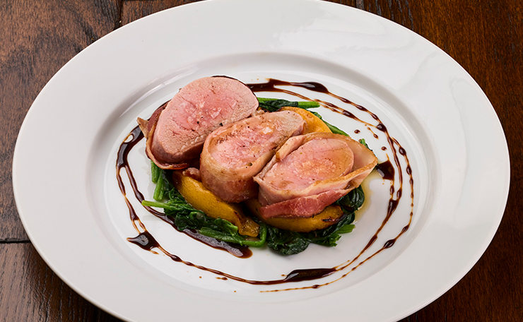 アメリカ南部の料理を再現した、完熟黄桃とローストポークを合わせた一皿。ヒレ肉にベーコンを巻いて、オーブンで丁寧に火入れ。ほうれん草のソテーを添え、仕上げにバルサミコのソースと焦がしバターをまとわせています。甘い黄桃とベーコンの塩気が生み出す甘じょっぱい味わいが、アメリカンポークのおいしさを一層引き立てます。