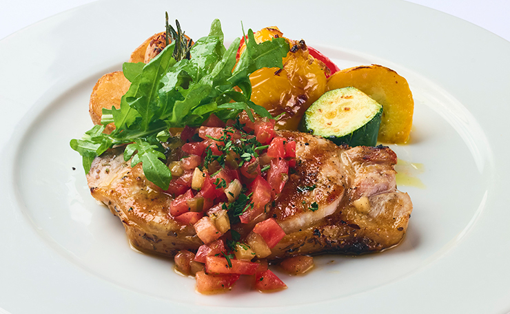 ローズマリーなどのハーブで丁寧にマリネしたアメリカンポークをじっくりローストし、しっとりと火入れした後は、ズッキーニやパプリカとともに香ばしくソテー。仕上げにトマトやピクルスを使った酸味のあるラビゴットソースをかけ、ハーブの香りと爽やかな酸味が重なり合う味わいに仕上げています。