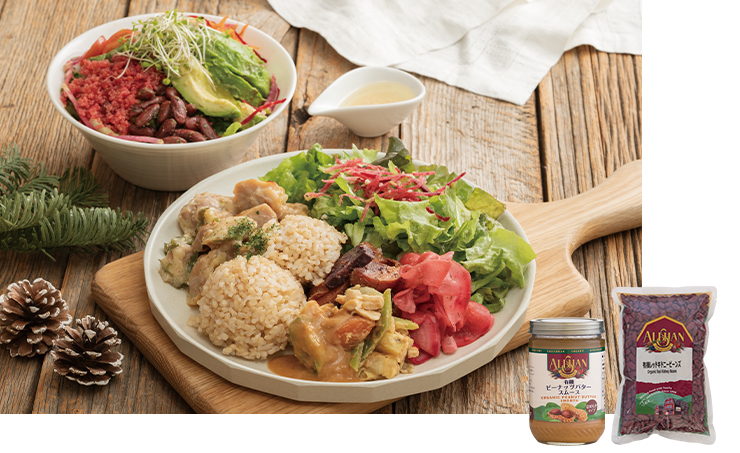 ランチプレートの副菜に、有機ピーナッツバターを使った胡麻和えが限定登場。濃厚なコクと旨味が広がる主役級の美味しさです。雑穀サラダは、レッドキドニービーンズの豆の風味をしっかりと感じることができ、甘酒フレンチドレッシングと相性抜群!ヘルシー度をアップしたい年末にお薦めです。