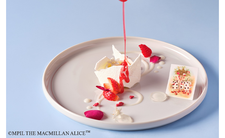 ハートの女王が白い薔薇を赤く塗らせる有名なシーンをモチーフにした、特別な一皿です。可憐な白い薔薇のムースを、自身で赤いラズベリーのソースやいちご、ベリー、赤い薔薇で飾り付け、赤い薔薇のお皿に変身させることができる体験型スイーツ。トランプたちの行動になぞらえたギミックが目でも舌でも楽しめる、動画撮影必至の一品となっています。