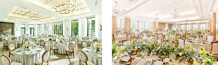 土日祝は、通常結婚式以外で入ることができない披露宴会場にてアフタヌーンティーが提供されます。煌びやかなシャンデリアや華やかな装飾で彩られた空間で、優雅なティータイムを過ごしてみて。