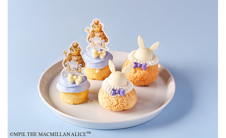 物語の主人公「不思議の国のアリス」が着ているドレスを、生クリームで表現したカップケーキ。青く染められた生クリームの濃厚な甘さと、しっとりとしたケーキ生地が相性抜群です。