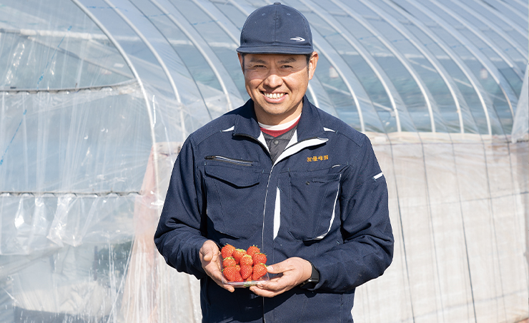 本フェアのいちごを生産する優峰園フルーツランド代表の田尻賢治さん。優峰園フルーツランドでは、いちごの他にみかん、梨、ぶどうなど四季折々の果物狩りを楽しめます。