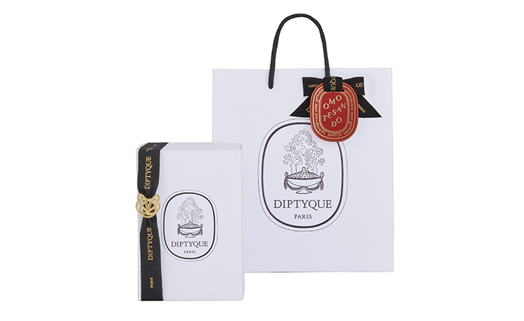 表参道店限定で、ギフトをお求めのお客様は限定のギフトラッピング水引「猫結び」とバッグタグを選べます。水引「猫結び」は、キャットストリートと今年のディプティックのホリデー物語への特別なオマージュです。