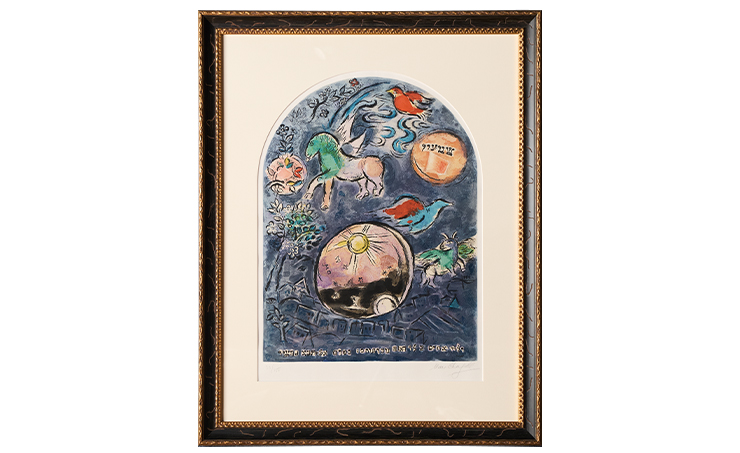 オペラ座の天井画(パリ)、国連総本部のステンドグラス(NY)等、数々の国家建造物を任され、「色彩の魔術師」とも言われた画家、マルク・シャガール。ピカソが嫉妬したと言われるほど美しいシャガールの色使いは、リトグラフ版画でも格別。アンドレ・ムルローという名の伝説の刷り師だけがシャガールのオリジナル版画を手がけており、本作もその一枚です。ステンドグラスを制作した際の作品で、窓の形になっているのが特徴です。
