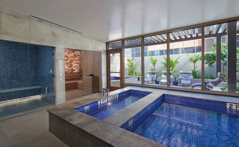 8階のスカイデッキには、肌に優しい温水ソルトウォーターの大型プール、25mラッププール(要予約)、ジャグジーを完備。