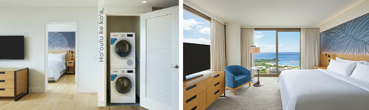 左:レジデンスタイプの客室には、洗濯乾燥機やフルキッチンを完備! 右:ホテルタイプの客室も広々。天井まで広がる大きな窓から、ハワイの景色を堪能できます。